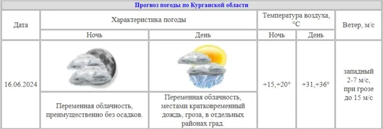 «Прогноз погоды по Курганской области на 16 июня. Переменная облачность, местами кратковременный дождь, гроза, в отдельных районах град. Ветер при грозе будет достигать 15 метров в секунду», — указано на сайте ведомства.