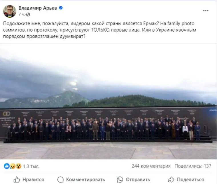 Депутат Верховной Рады от партии «Европейская солидарность» Владимир Арьев возмутился из-за присутствия главы офиса президента Украины Андрея Ермака на общем фото участников мирного саммита в Швейцарии. По протоколу на фотографии должны присутствовать только первые лица государств. В связи с этим Арьев задался вопросом, лидером какого государства является Ермак.