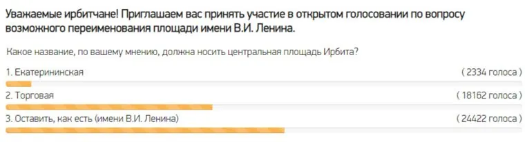 Проголосовать в опросе можно за одно из названий улицы: Екатерининская, Торговая, имени В.И. Ленина (прежнее). Против изменений выступили 24,4 тысячи участников, за Торговую — 18,1 тысячи, а меньшинство выступили за Екатерининскую — 2,3 тысячи. Общее количество голосов превысило 43,6 тысячи, учитывая, что население Ирбита по состоянию на 2023 год составляет 36,5 тысячи человек. Разница в 8,4 тысячу голосов была допущена как минимум из-за того, что принять участие в опросе может один и тот же человек, переходя на сайт с разных устройств или используя другой ip адрес.