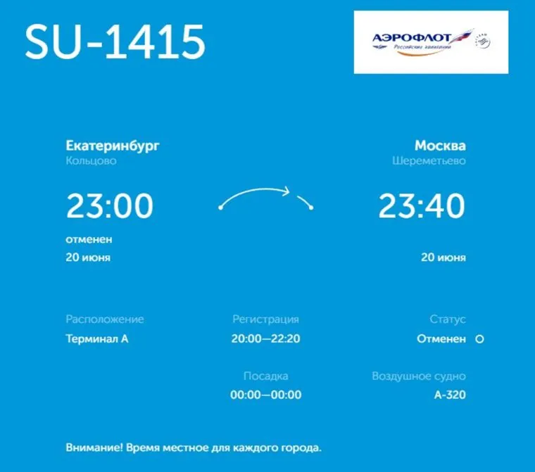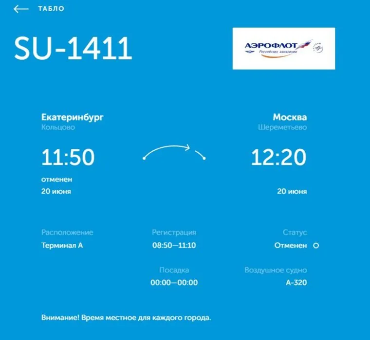 «В Екатеринбурге отменен рейс SU-1411, вылет которого был запланирован на 11:50. Самолет должен был приземлиться в Москве в 12:20 по местному времени. Также отменен вылет рейса SU-1415, запланированного на 23:00», — говорится на сайте воздушной гавани.