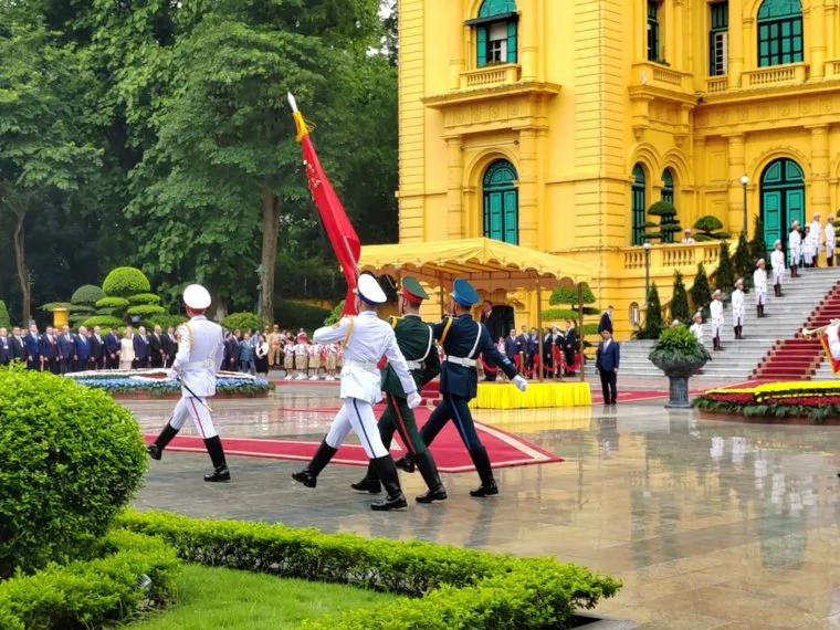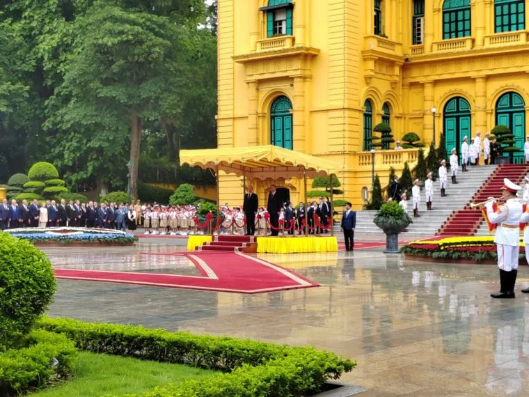 Российского президента встречают высокопоставленные вьетнамские официальные лица. Среди них президент страны То Лам, вице-премьер Чан Хонг Ха, заведующий отделом ЦК КПВ по международным вопросам Ле Хоай Чунг и заместитель министра иностранных дел СРВ Ле Тхи Тху Ханг. Некоторые из официальных представителей владеют русским языком, что способствует взаимодействию между представителями стран.
