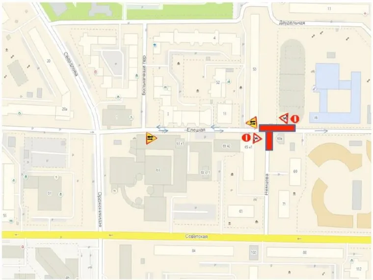 На период проведения работ будет организовано двустороннее движение по ул. Елецкой от Больничного переулка до ул. Немцова. Водителям рекомендуется использовать альтернативные маршруты, которые проходят по ул. Профсоюзная, ул. Советская и ул. Орджоникидзе, а также следить за дорожными знаками.