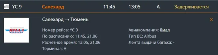 «Уважаемый пассажир! Время вылета/прилета было изменено! УС9/210624 вылет 11:30 прилет 13:05. Маршрут SLY-TJM», — написано в сообщении. Ранее вылет планировался на 10:10.