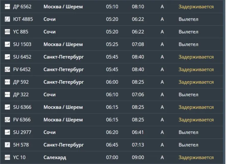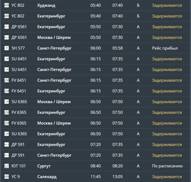 «Вылет: ДР 6562 — Москва / Шерем — задерживается, SU 6452 — Санкт-Петербург — задерживается, FV 6452 — Санкт-Петербург — задерживается, ДР 592 –Санкт-Петербург — задерживается, SU 6366 –Москва / Шерем — задерживается, FV 6366 — Москва / Шерем — задерживается, YC 10 — Салехард — задерживается», — следует из онлайн-табло. На прилет задерживаются семь рейсов из Екатеринбурга, три — из Москвы, три — из Санкт-Петербурга, по одному из Худжанда, Сургута и Салехарда.