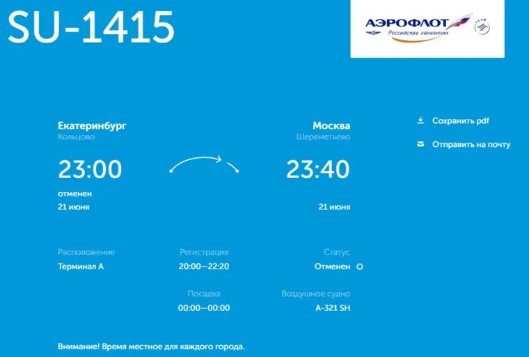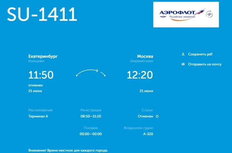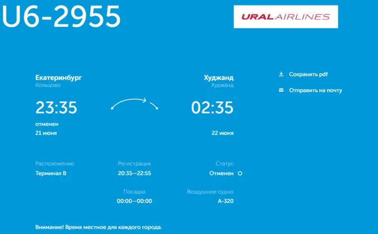Рейс SU-1411 «Аэрофлота» должен был вылететь из Кольцово в Москву 21 июня в 11:50, а второй полет в столицу рейсом SU-1415 был запланирован в 23:00. Самолет «Уральских авиалиний» (рейс U6-2955) в Худжанд (Таджикистан) зарегистрирован на 23:35, но его статус также «отменен».