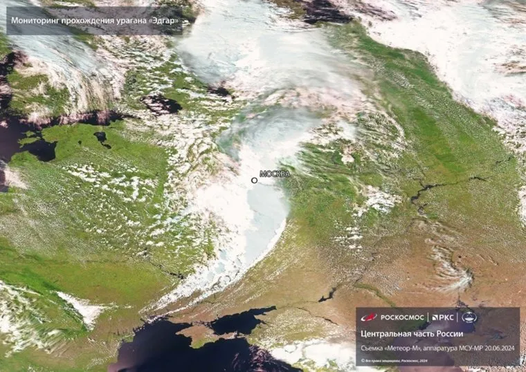 «На спутниковом снимке „Метеора-М“ — мониторинг прохождения урагана „Эдгар“. Вчера он накрыл Москву и Московскую область, сопровождался разрушительным ветром, ливнем с грозой и смерчами. Холодный фронт движется в восточном направлении и уже добрался до Пермского края», — говорится в сообщении Роскосмоса.