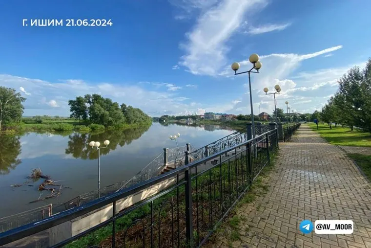 В посте он опубликовал два фото набережной в городе Ишим. Снимки сделаны в апреле и июне. На свежих кадрах уровень реки заметно снизился.
