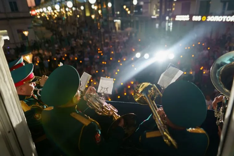 Незадолго до начала мероприятия многие проходившие мимо горожане спрашивали, что здесь будет, и услышав в ответ «День памяти и скорби», благодарили и вместе со всеми ждали начала. Все более ярким становился медиаэкран и все более отчетливыми слышалась звуки мелодий. Неожиданно зазвучал голос Юрия Левитана – о том, что началась война. На импровизированную сцену (небольшой балкон, расположенный в одном из исторических домов на Вайнера) вышли военные в парадной форме с песней «Вставай, страна огромная».