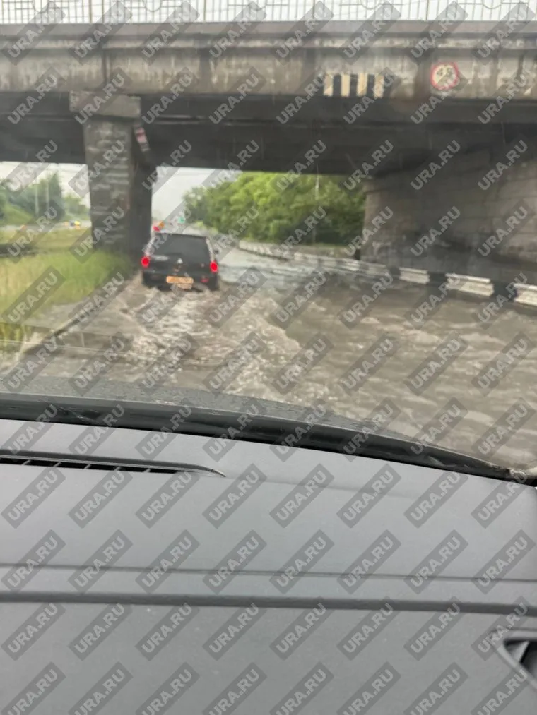 18:42 Корреспонденты URA.RU делятся кадрами из города, уходящего под воду. Многие жители прячутся от дождя в переходах метро и под козырьками домов.