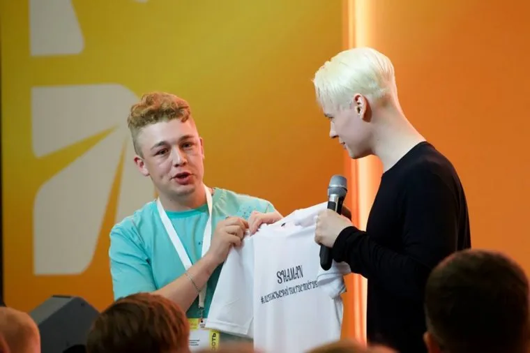 «От Курганской области мы дарим Вам небольшой подарок. Это наш мерч», — с этими словами молодой курганец вручил SHAMAN футболку. Певец поблагодарил участника форума за подарок.