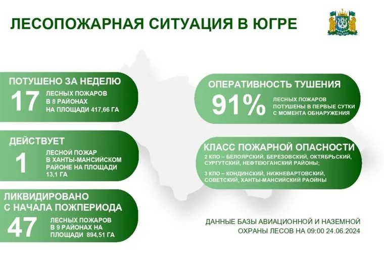 «В регионе проводятся работы по тушению лесного пожара на площади 13,1 га в Ханты-Мансийском районе. За минувшую неделю — с 17 по 23 июня, лесопожарные формирования Югры ликвидировали 17 лесных пожаров на площади 417,66 га», — сообщил Департамент недропользования Югры в telegram-канале.