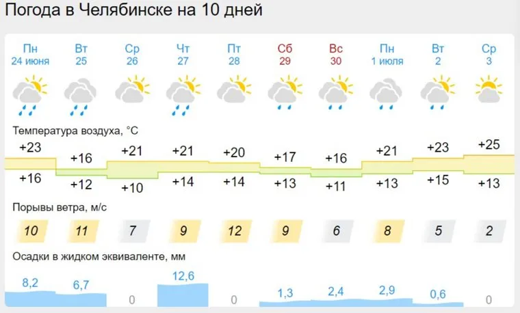 «С 24 по 30 июня в Челябинске ожидаются дожди, особенно сильные 27 июня, когда обещают 12.6 мм осадков. Дневные температуры воздуха составят от 16 до 21 градуса», — указано на сайте синоптиков.