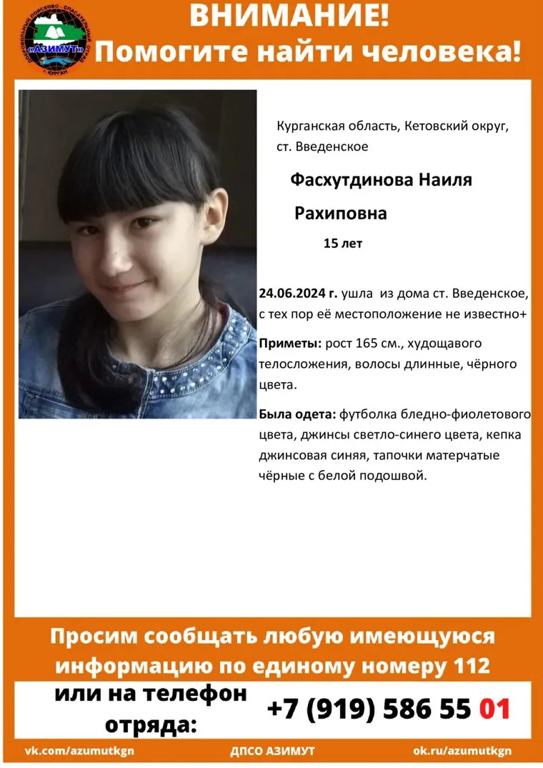 «Может находиться в Челябинской области. Наиля Ф., 15 лет, 24 июня ушла из дома на станции Веденское, Кетовский район», — говорится в объявлении в группе «Легион-Спас» — поиск пропавших детей Челябинск.