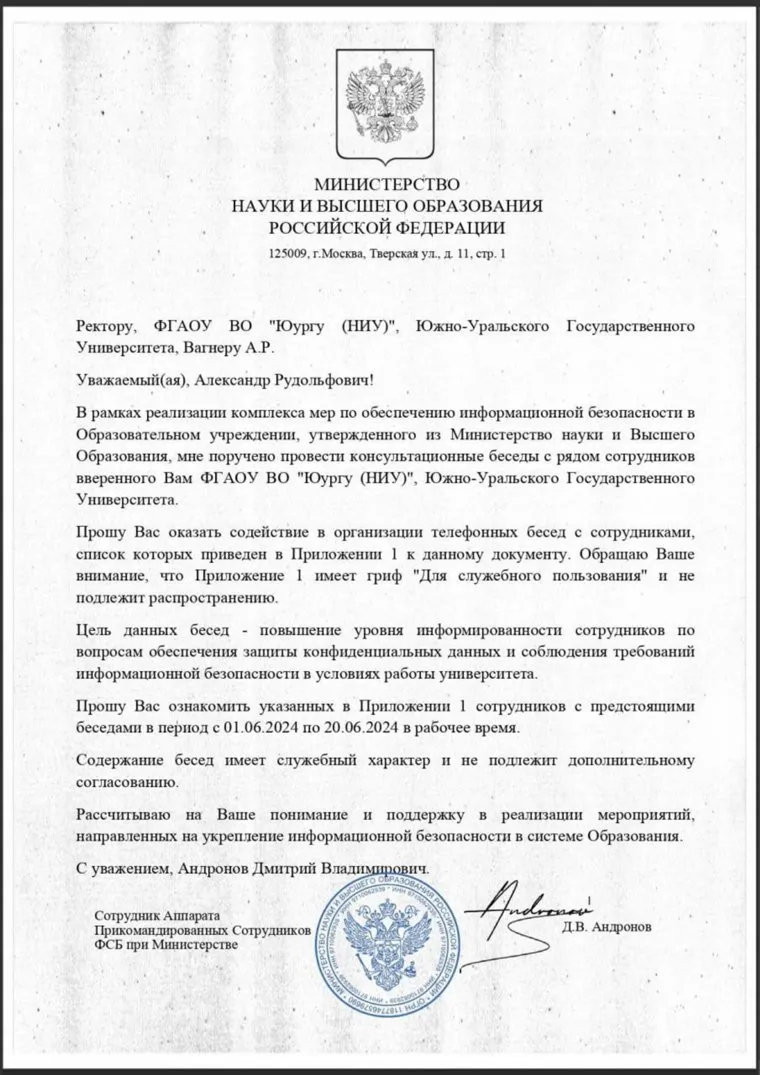 Ректор Южно-Уральского госуниверситета Александр Вагнер 25 июня предупредил о том, что мошенники пользуются бланками Минобрнауки России для рассылки фейков. Соответствующий пост Вагнер разместил в своем telegram-канале.