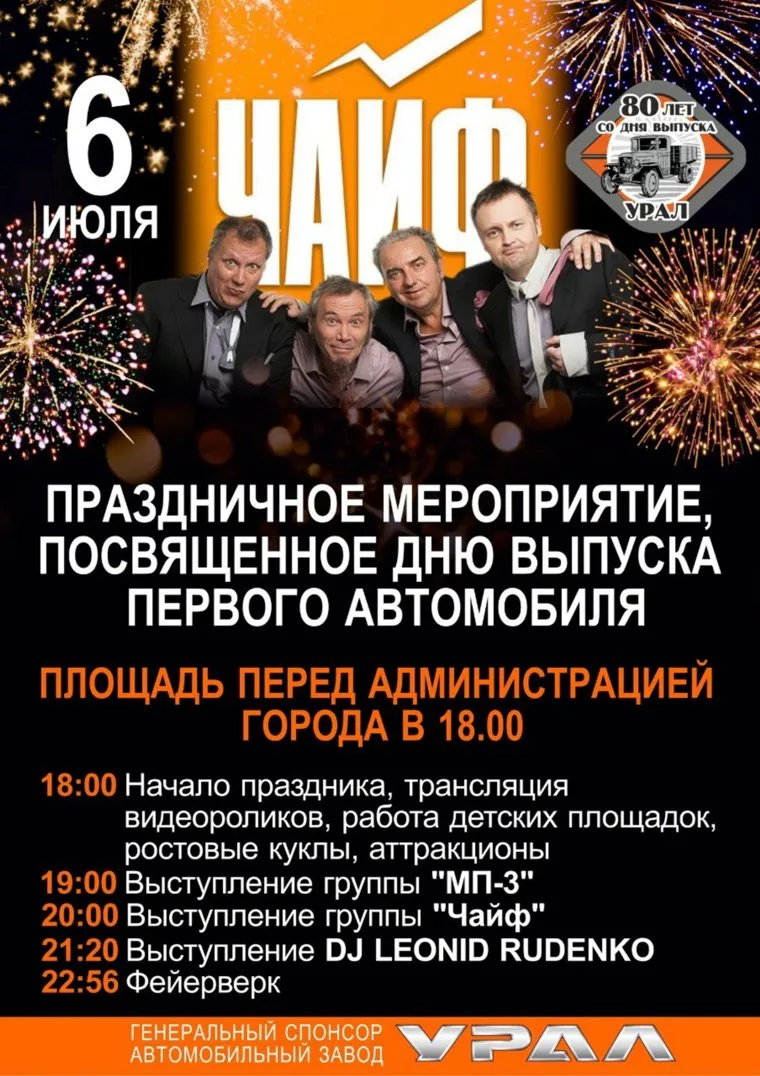 «В Миассе пройдет праздничное мероприятие, посвященное Дню выпуска первого автомобиля АЗ „УРАЛ“. На центральной площади 6 июля, в 18:00 будет организована площадка с аттракционами, где детей встретят ростовые куклы. За музыкальное сопровождение будут отвечать миасская группа „МП-3“ и гости — группа „Чайф“ и DJ LEONID RUDENKO», — сообщили в мэрии.
