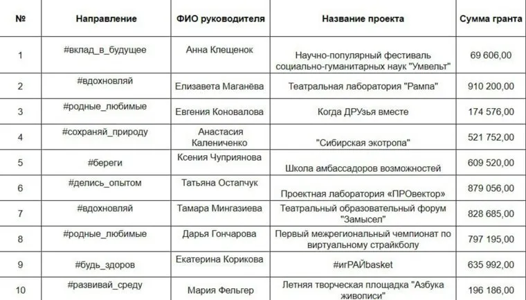 «Молодые тюменцы на грантовом конкурсе Росмолодежи получили 5 622 768 рублей. По итогам первого сезона конкурса „Росмолодежь.Гранты“, 10 проектов от жителей Тюменской области стали победителями», — написано на сайте ведомства.