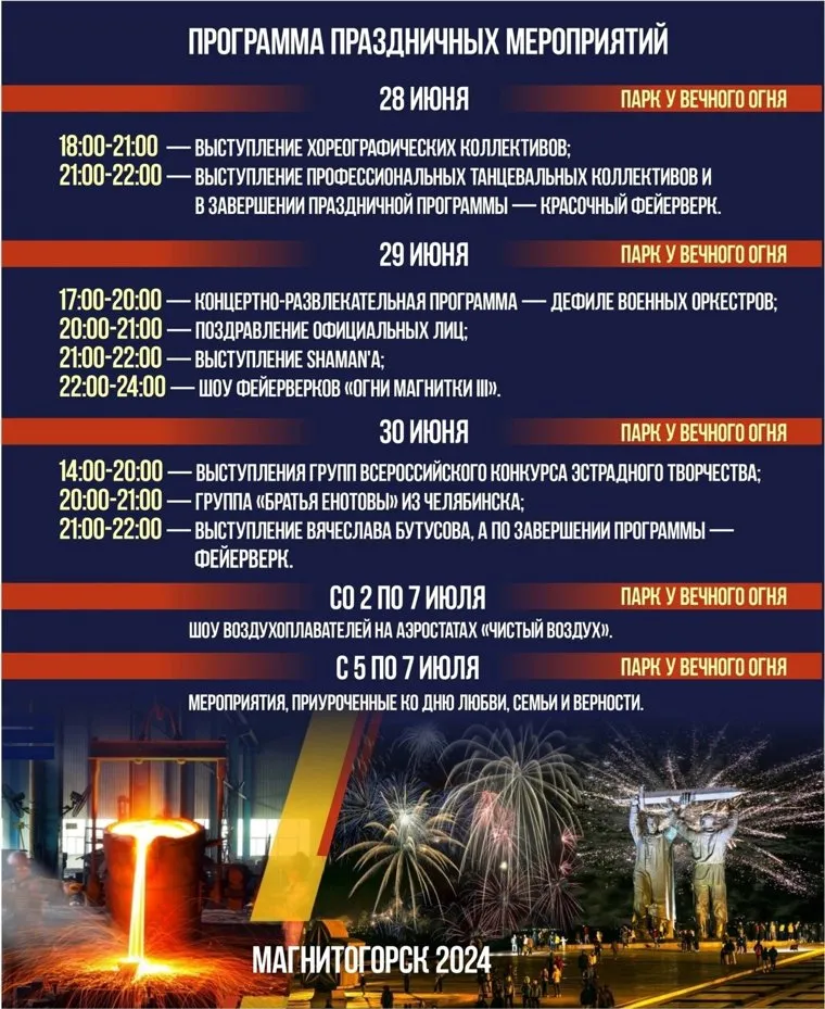 В Магнитогорске с 28 по 30 июня отметят День города. Металлурга. Фейерверки будут греметь все три дня, а на сцене появятся артисты SHAMAN и Вячеслав Бутусов, сообщили URA.RU в управлении культуры города.
