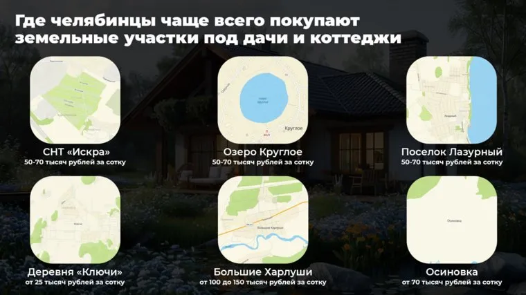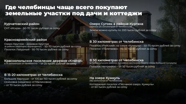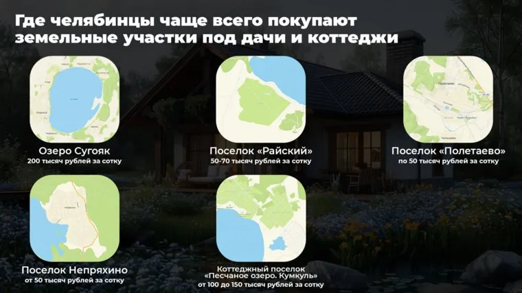 «В Челябинске недорогие земельные участки под строительство дач можно приобрести в Курчатовском районе в СНТ „Искра“. Также выгодны с экономической точки зрения земельные участки в районе аэропорта Баландино, недалеко от озера Круглого, в одноименной деревне. Участки на данных территориях можно приобрести за 50—70 тысяч рублей за сотку», — сообщила Шатрукова.