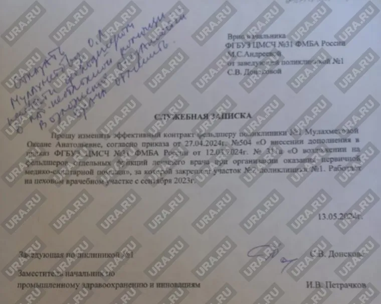 Сотрудники Центральной медико-санитарной части №31 в Новоуральске (Свердловская область) взбунтовались после смены руководства и написали коллективную жалобу на новых шефов — Гарика Хачатряна и Ивана Петрачкова. Жалоба, под которой подписались 37 человек, направлена президенту РФ Владимиру Путину и главе СК Александру Бастрыкину. Об этом URA.RU рассказали участники протеста.