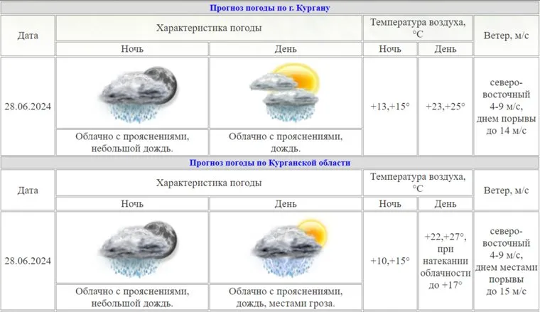 «Курганская область, 28 июня. Прогнозируется температура 22-27 градусов, ветер северо-восточный 4-9 метров в секунду, возможны порывы до 15 метров. Облачно с прояснениями, дождь, местами гроза», — сообщили на сайте ЦГМС.