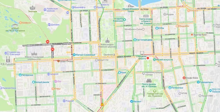 В Челябинске 28 июня в десятибалльную пробку встал перекресток проспекта Ленина и улицы Энгельса. Причиной затруднения движения в центре города, согласно сервису «Яндекс Карты», стало перекрытие подъездов к парку Гагарина.