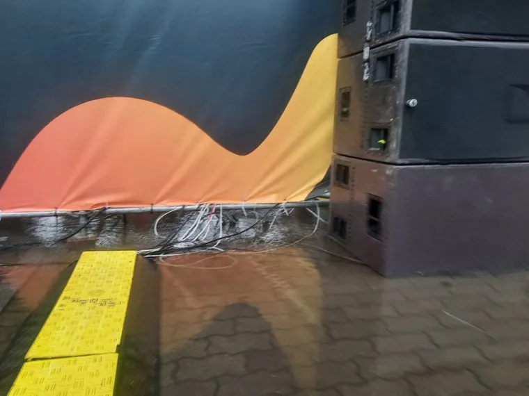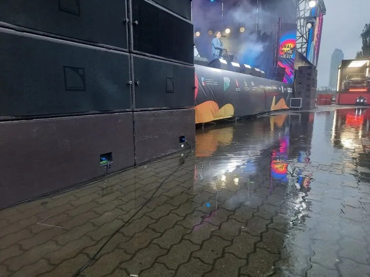 20:52 Провода сцены на площадке Октябрьской революции залило дождем. При этом вся техника работает исправно.