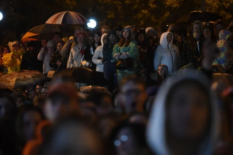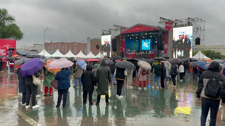 19:33 Несмотря на дождь, на Октябрьской площади собираются зрители. «Все дружно подпевают песню „Школьная московская любовь“ и кричат „браво“» — передает корреспондент URA.RU.