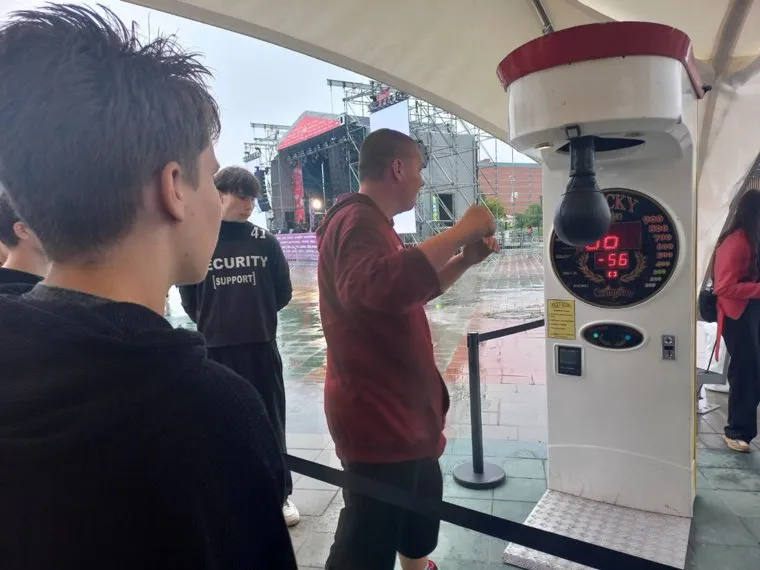 18:06 Зрители продолжают прятаться под шатрами и развлекать себя настольным хоккеем, боксерской грушей баскетбольным кольцом. Обладатели зонтов и дождевиков иногда подбираются к сцене.
