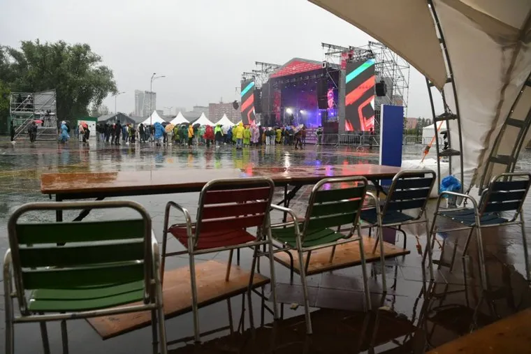 19:30 На сцене начали проводить первые выступления, но пока людей немного. Артисты всеми способами стараются подбадривать зрителей, которые не побоялись ливня и пришли на площадку.