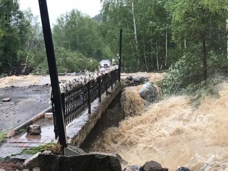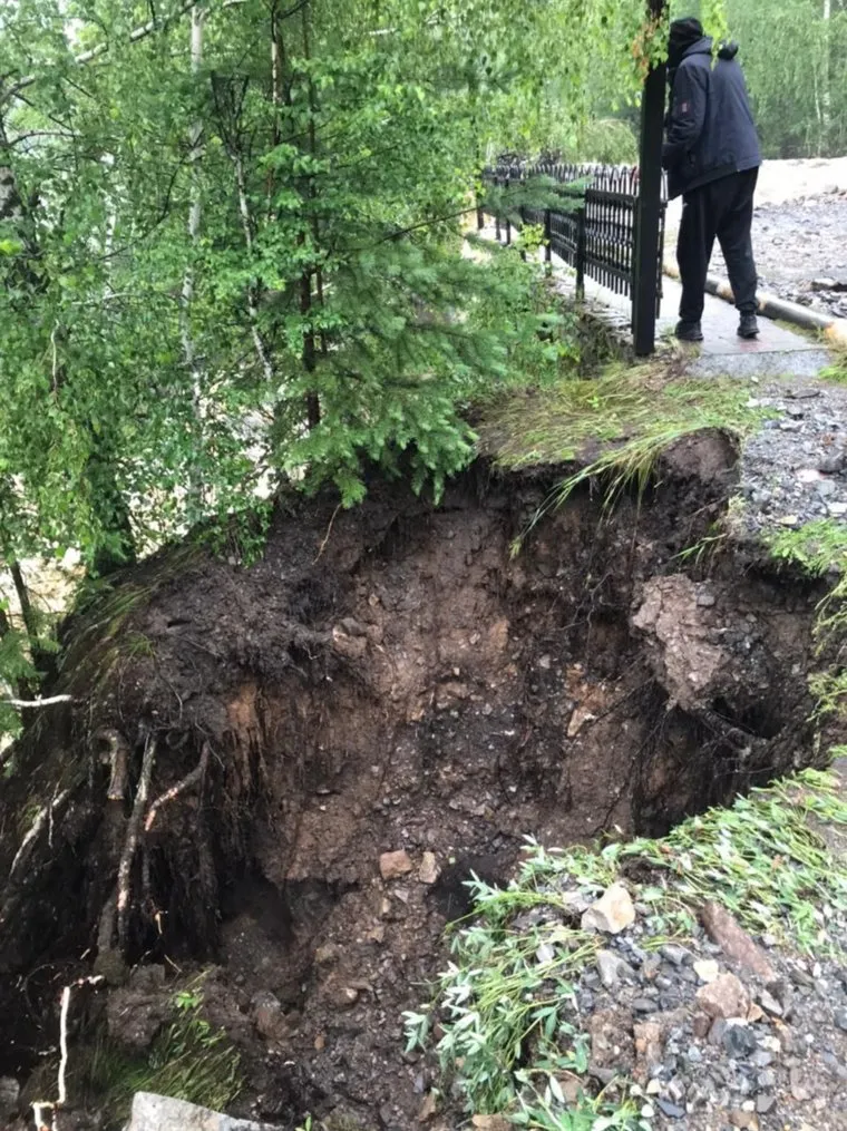 Возле моста в Челябинской области из-за ливня провалилась почва. Фото, видео