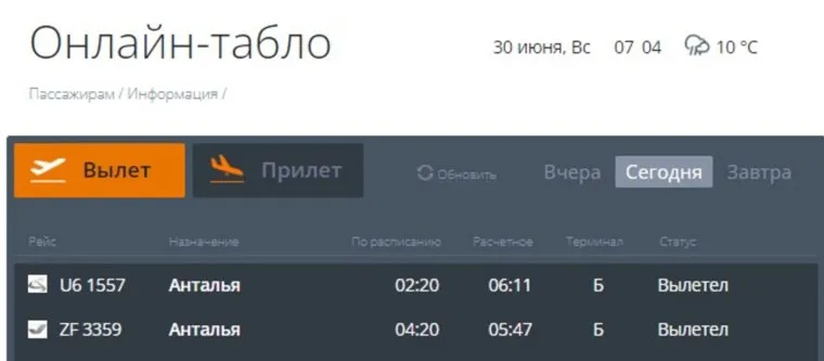 «Авиакомпания „Уральские авиалинии“, рейс Тюмень — Анталья, плановое время вылета 30 июня 2024 года в 2:20, фактическое время вылета 30 июня в 6:11. Авиакомпания Azur Air, рейс Тюмень — Анталья, плановое время вылета 30 июня в 4:20, фактическое — 30 июня в 5:47», — следует из онлайн-табло аэропорта Рощино.