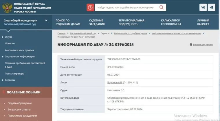 «Воронов А.В. Статья 290 часть 6 УК РФ», — указано в карточке дела на официальном сайте. Дело зарегистрировано 3 июля 2024 года.