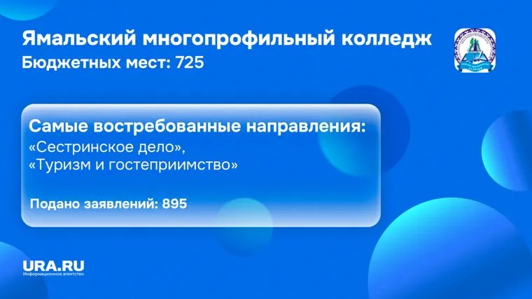 В ЯНАО объявили результаты ЕГЭ и ГИА, а это значит, что выпускники ямальских школ начали активно подавать заявления на поступление. На территории региона получить образование можно только в колледжах. О ходе приемной кампании в учебных заведениях ЯНАО, количестве бюджетных мест и самых популярных у абитуриентов направлениях смотрите в инфографике, подготовленной URA.RU.