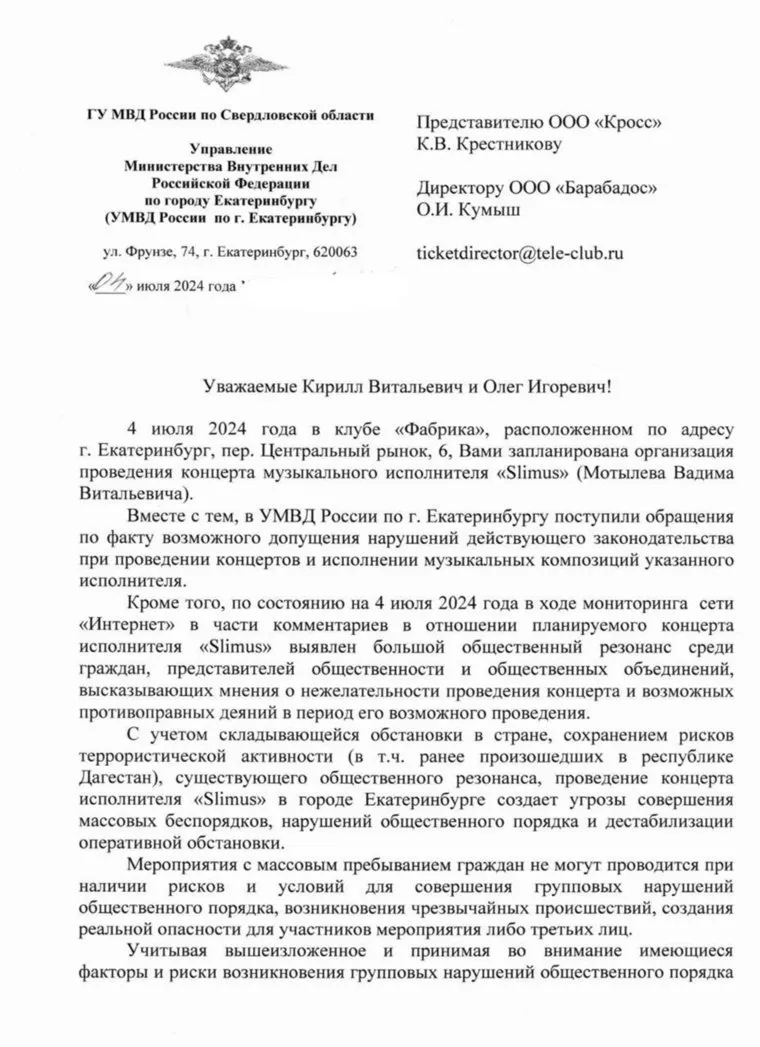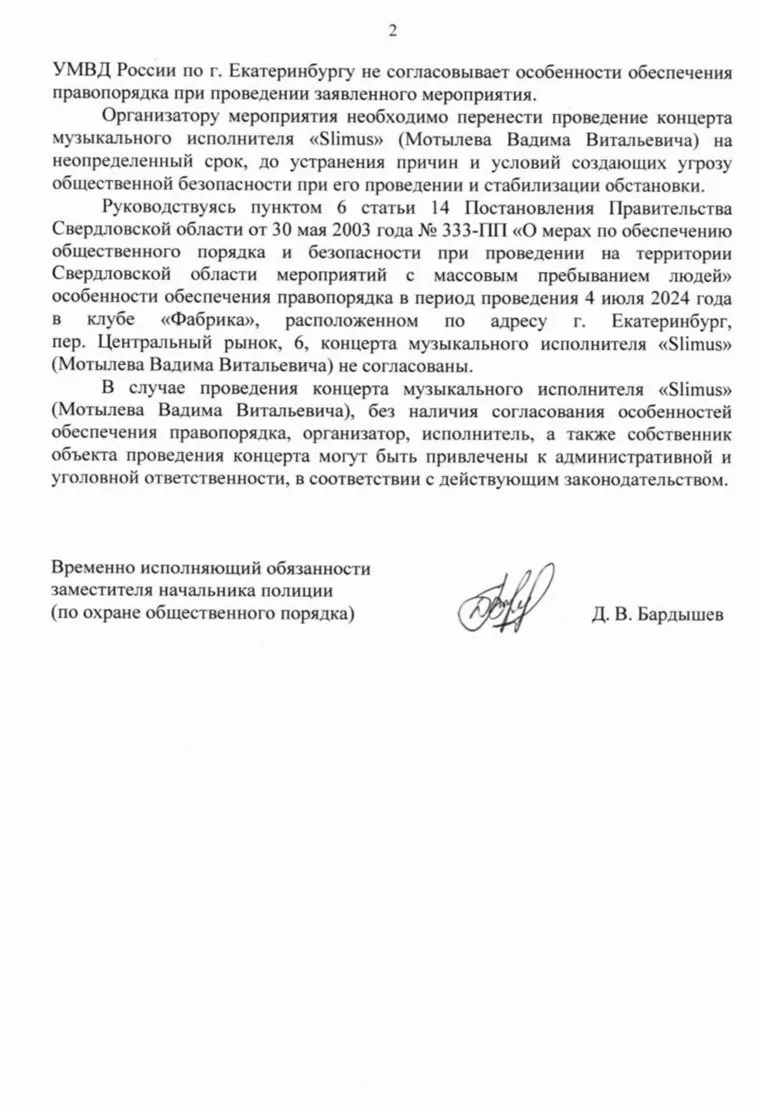 Также она опубликовала документ за подписью врио замначальника полиции Екатеринбурга по охране общественного порядка Дмитрия Бардышева. «В УМВД по Екатеринбургу поступили обращения по факту возможного допущения нарушений законодательства при проведении концертов и исполнения музкомпозиций указанного исполнителя. Кроме того, в Сети в комментариях выявлен общественный резонанс среди граждан, высказывающих мнения о нежелательности возможного проведения концерта. <…> Организатору необходимо перенести концерт на неопределенный срок, до устранения причин и условий создающих угрозу общественной безопасности», — следует из документа.
