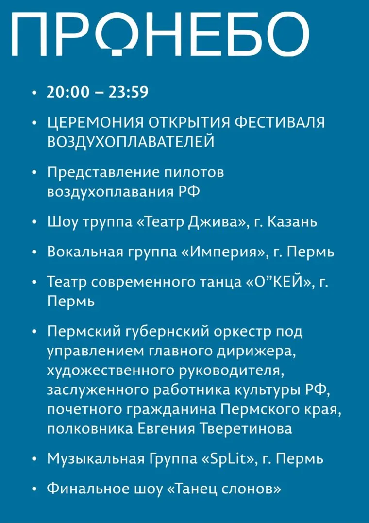Фестиваль воздухоплавания «Пронебо», который пройдет в Кунгурском округе Пермского края, опубликовал программу. Из 26 пунктов только три касаются воздушных шаров. В основном публику 13 июля будут развлекать музыканты, актеры, аниматоры и торговцы. Среди музыкальных коллективов, которые выступят на празднике Пермский губернский оркестр и рок-группа Split.