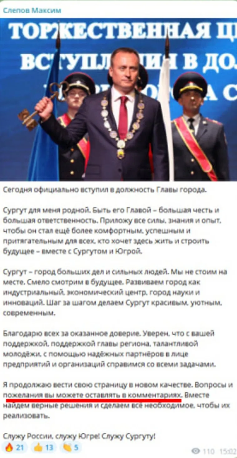 Пиарщики нового главы Сургута (ХМАО) Максима Слепова поставили его в неловкое положение буквально через полчаса после завершения торжественной церемонии вступления в должность. Опубликованный сразу после инаугурации пост от имени градоначальника призывал жителей оставлять обращения, но вот telegram-канал оказался недоступным для комментариев. На это обратили внимание источники URA.RU в политическом истеблишменте округа.
