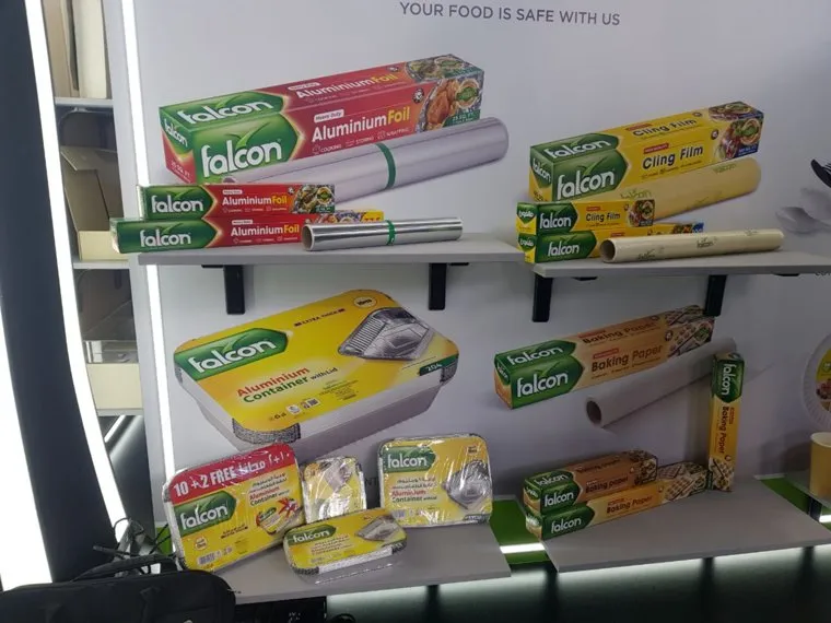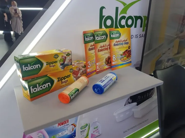 Арабский бренд Falcon производит различные товары для хранения и приготовления продуктов. На стенде компании выставлена пищевая фольга, бумага для выпечки, формы для запекания из фольги — в упаковке 12 штук. Кроме этого, есть мешки для мусора и пакеты для хранения и заморозки продуктов.