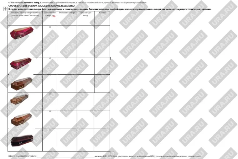 Изделия, которые ранее назывались как гробы с узором либо крестом «Версаче», теперь идут без описания. Однако в таблице есть фотографии, которые изготовителю предлагается использовать в виде референса. Изделие должно полностью соответствовать фото, иначе не будет оплачено. На закупку выделено полмиллиона рублей.