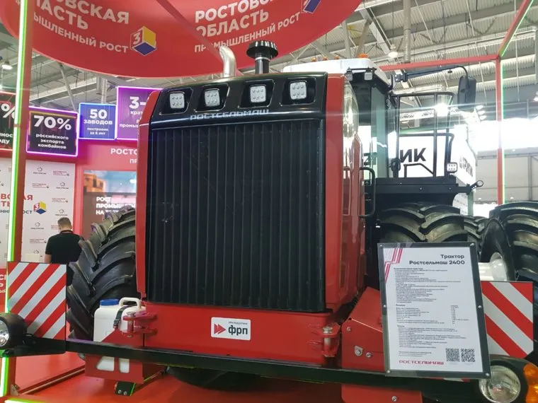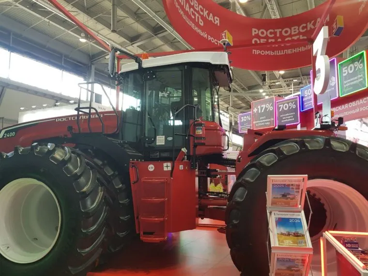 Ростовская область выставила огромный трактор «Ростсельмаш». Техника оборудована автопилотом с электроприводом руля, в кабине — система кондиционирования и обогрева. Трактор полностью производится на территории России.