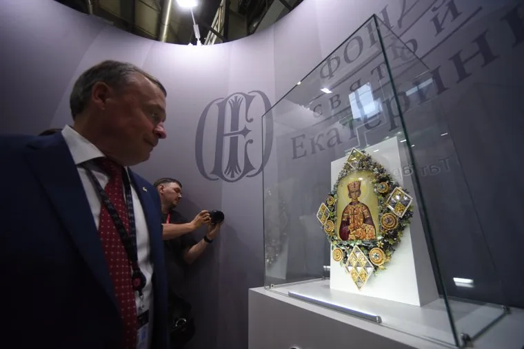 Фонд Святой Екатерины представил иконы, оклады которых изготовлены с применением драгоценных металлов, камней и жемчуга. Как сообщает источник агентства, каждая из икон стоит не менее 10 миллионов рублей. Коллекция принадлежит меценату и бизнесмену Андрею Симановскому.