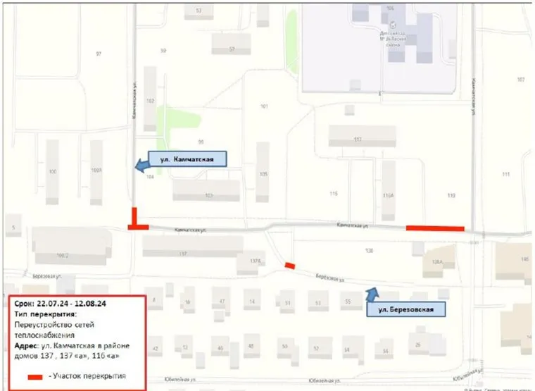 «В связи с выполнением работ по переустройству сетей теплоснабжения в период с 22.07.2024 по 17.08.2024 будет прекращено движение на следующих участках автомобильных дорог: на перекрестке в районе дома по ул. Камчатской, 137; в районе дома по ул. Камчатской, 116 „а“; на перекрестке ул. Камчатской и ул. Березовой», — указано в сообщении городской администрации.