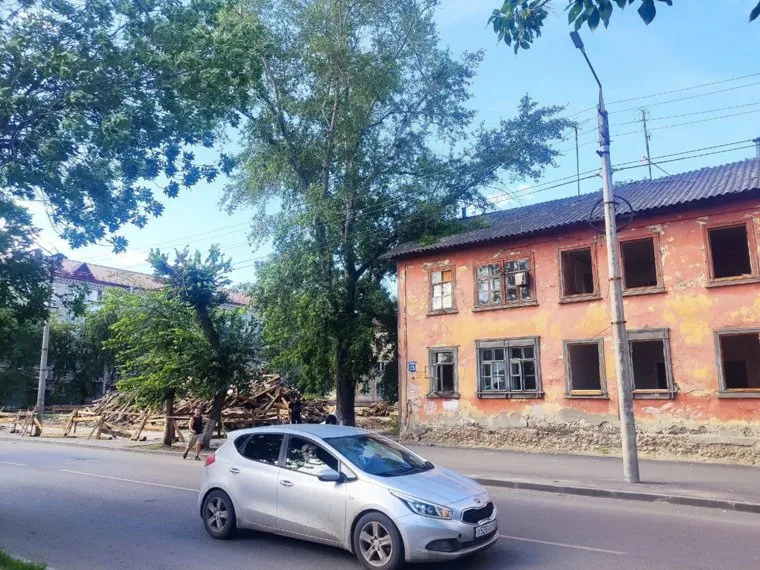 Строители утром 9 июля начали перекрывать проход по тротуару возле третьего оставшегося дома на улице Кирова, 73. «Ставь деревянные ограждения тоже. Иначе пешеходы будут подныривать под ленту и все равно идти, рискуя попасть под падающие конструкции», — обсуждали между собой строители.