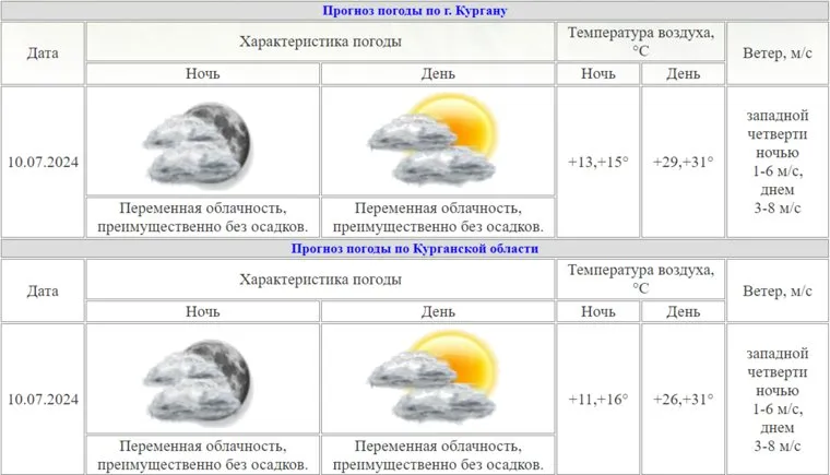 В Кургане так же ожидается погода с переменной облачностью, без осадков и 31 градусом жары. Возможны порывы ветра до восьми метров в секунду.