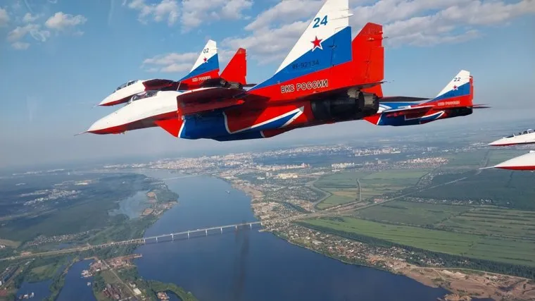 «Здравствуй, Пермский край!» — говорится на странице группы в соцсети «ВКонтакте». К посту прикреплено фото брендированного самолета МиГ-29, который пролетает над Пермью.