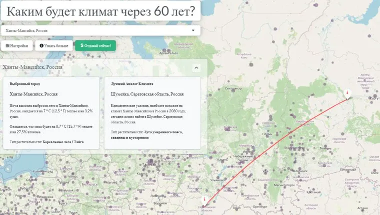 «Из-за выброса парниковых газов лето в Ханты-Мансийске ожидается на 7 градусов теплее. Зима будет на 8,7 градусов теплее и на 27,5% влажнее. Климатические условия, наиболее похожие на климат Ханты-Мансийка в 2080 году, сегодня можно найти в Шумейке, Саратовской области», — следует из данных интерактивной карты Future Urban Climates.