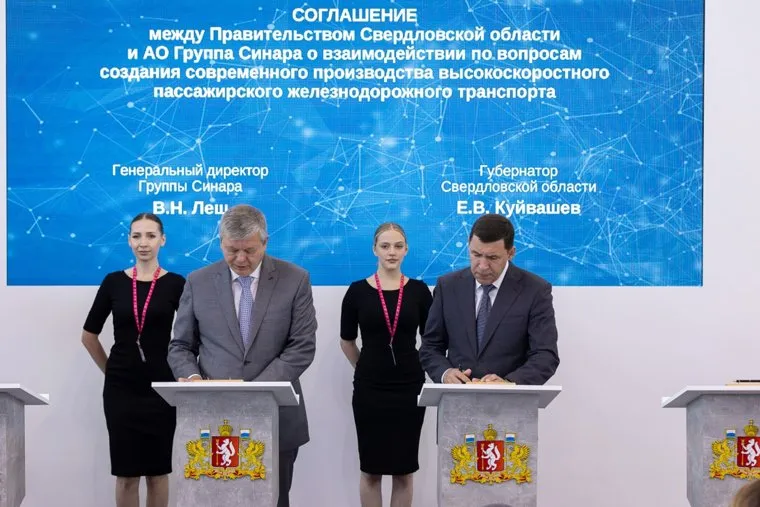 Губернатор Свердловской области Евгений Куйвашев и гендиректор Группы Синара Виктор Леш заключили соглашение о производстве высокоскоростных поездов. Документ подписали на полях промышленной выставки «Иннопром-2024». Первые два поезда появятся в 2028 году.