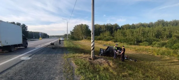 На трассе под Челябинском водитель автомобиля погиб, врезавшись в столб. Фото
