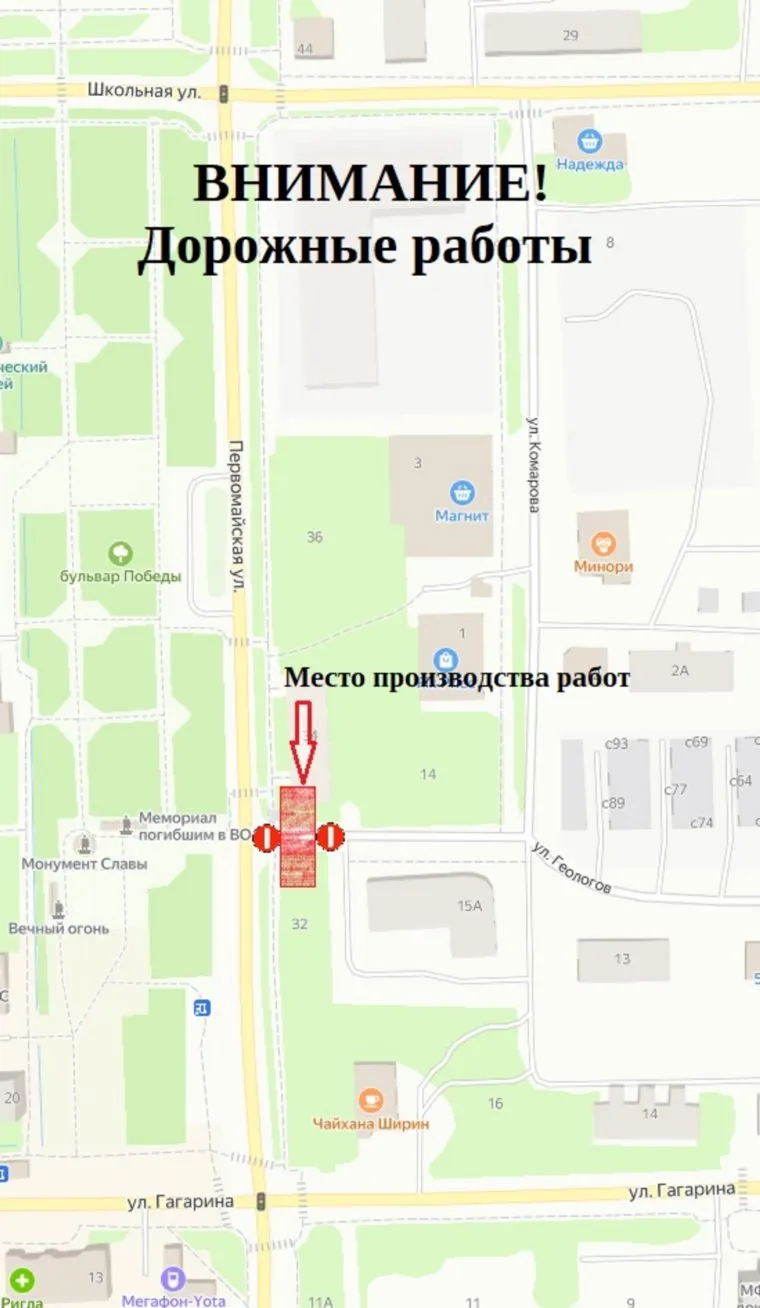 «В связи с необходимостью производства работ по строительству сетей ТВС и канализации будет ограничено движение всех транспортных средств и пешеходов на участке улицы Геологов от улицы Первомайская до дома №15А», — говорится на сайте управления. Ремонт будет проходить в период с 08:00 22 июля до 20:00 12 августа.