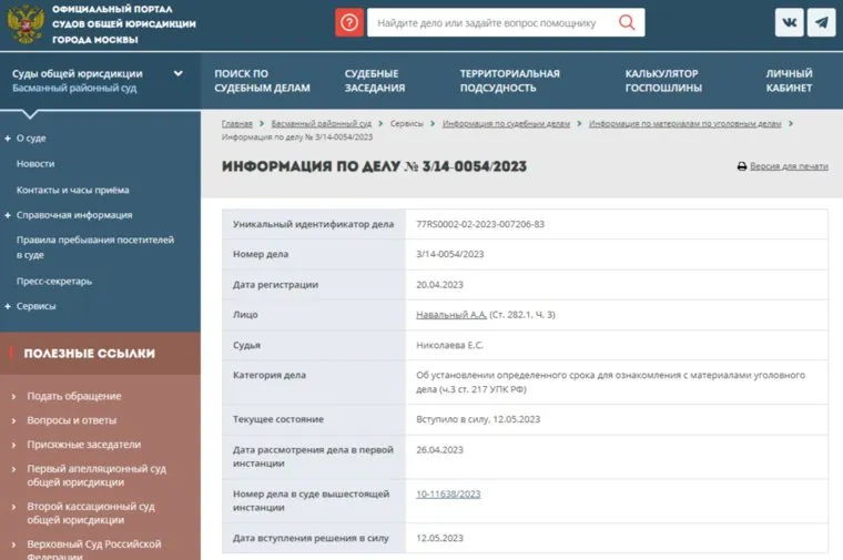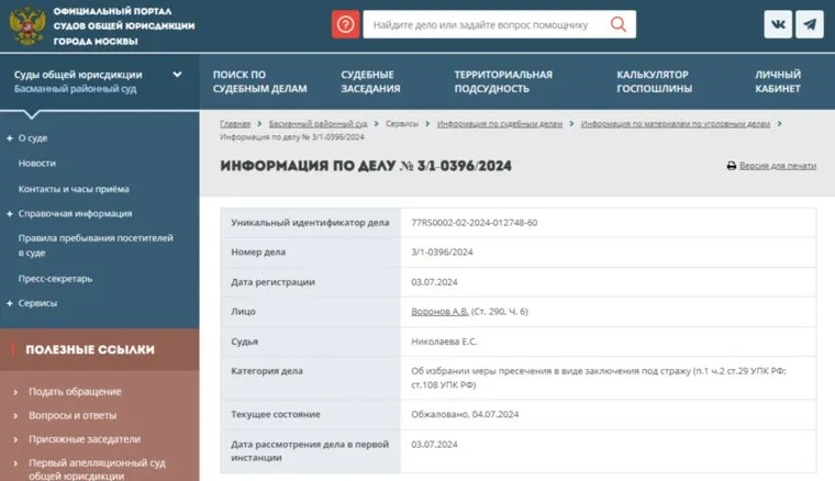 «Воронов А.В. (Статья 290, часть 6). Судья: Николаева Е.С.», — указано в карточке дела экс-мэра Воронова. Из данных по делу Алексея Навального следует, что та же судья 26.06.2024 выносила решение по делу «об установлении определенного срока для ознакомления с материалами уголовного дела».