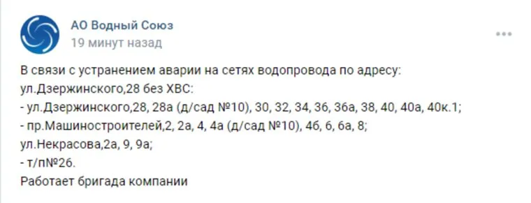Жители следующих адресов остались без холодной воды: ул. Дзержинского (от 28 до 40к.1), пр. Машиностроителей (от 2 до 8), ул. Некрасова (2а, 9, 9а) и территориальный пункт №26. Восстановление водоснабжения будет осуществлено после завершения ремонтных работ.